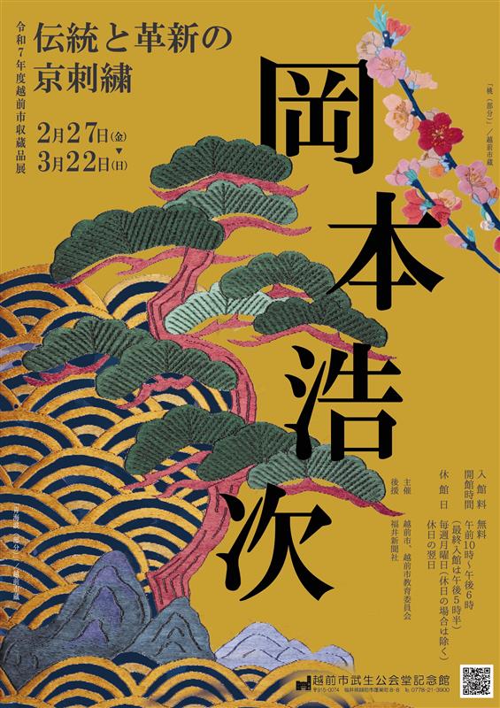 本展では、京刺繍家 岡本 浩次 氏から当市に寄贈された165点にのぼる京刺繍作品の中から、選りすぐりの作品をご紹介し、 令和6年に逝去された岡本氏の功績を偲びます。圧巻の京刺繍作品の数々をご堪能ください。 ▼開催期間 期間 令和8年2月27日(金曜日)から3月22日(日曜日)まで 休館日 毎週月曜日(休日の場合は除く)、休日の翌日 開館時間 午前10時~午後6時(最終入館午後5時30分) ▼会場 越前市武生公会堂記念館 2階 展示室2 ▼入場料 無料 ▼関連イベント